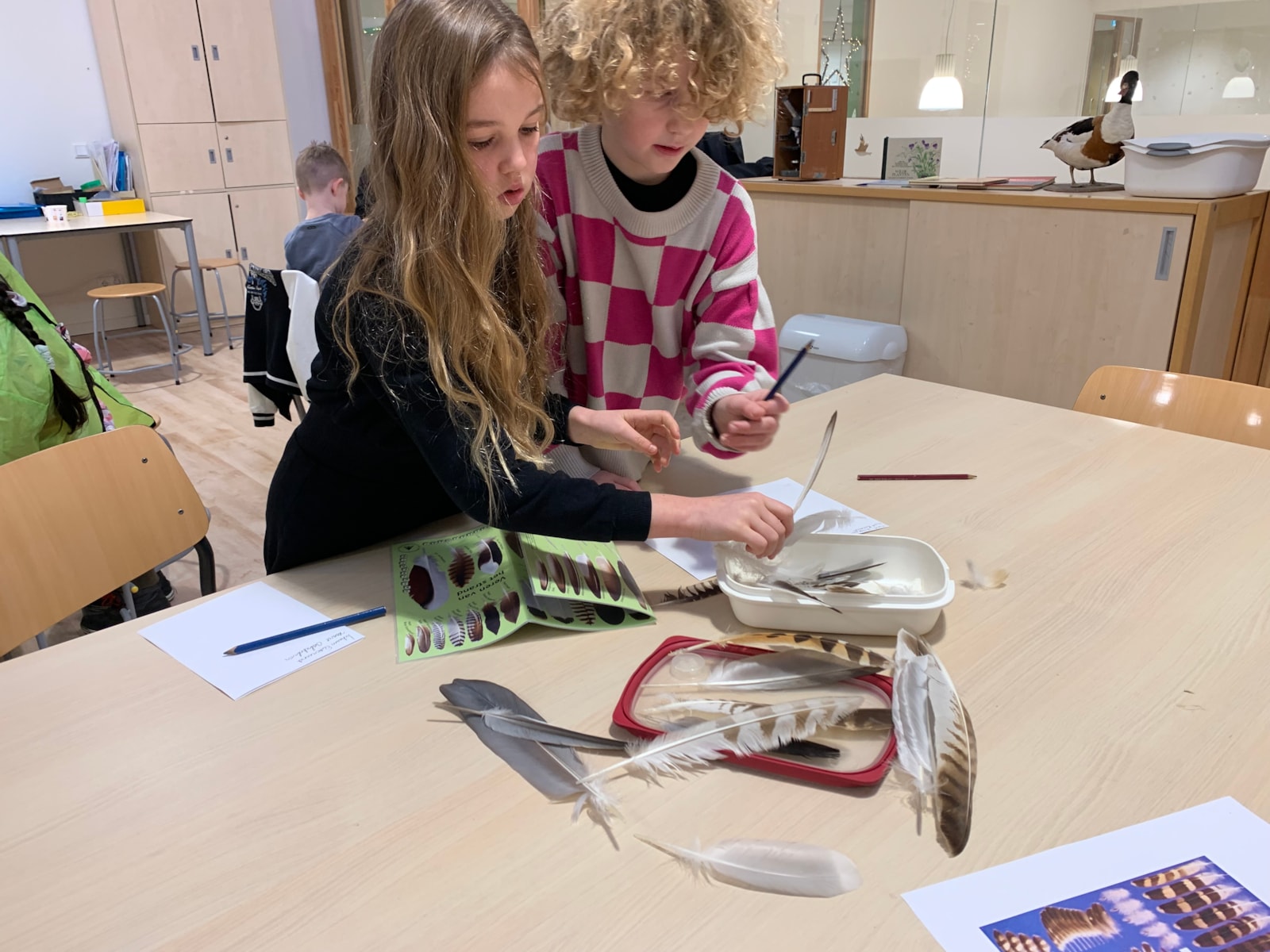 aan de hand van een zoekkaart verschillende veren determineren (van welke vogel, handpen, armpen of staartpen?) en opschrijven welke het zijn.